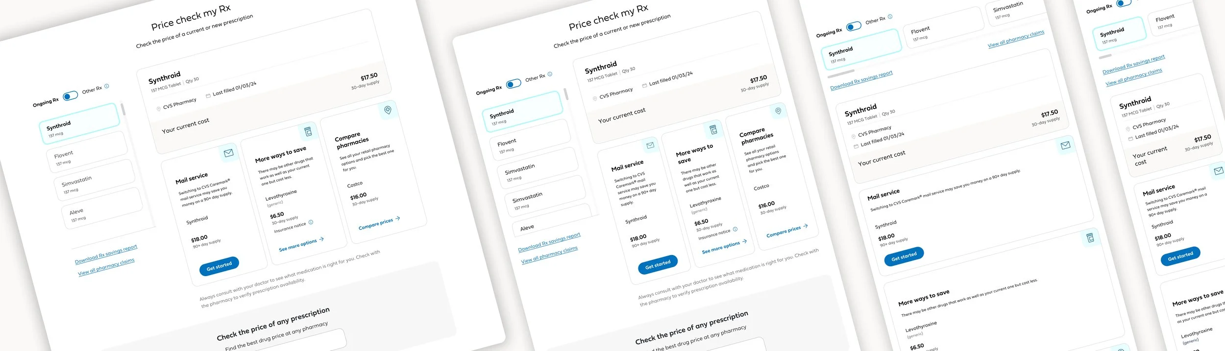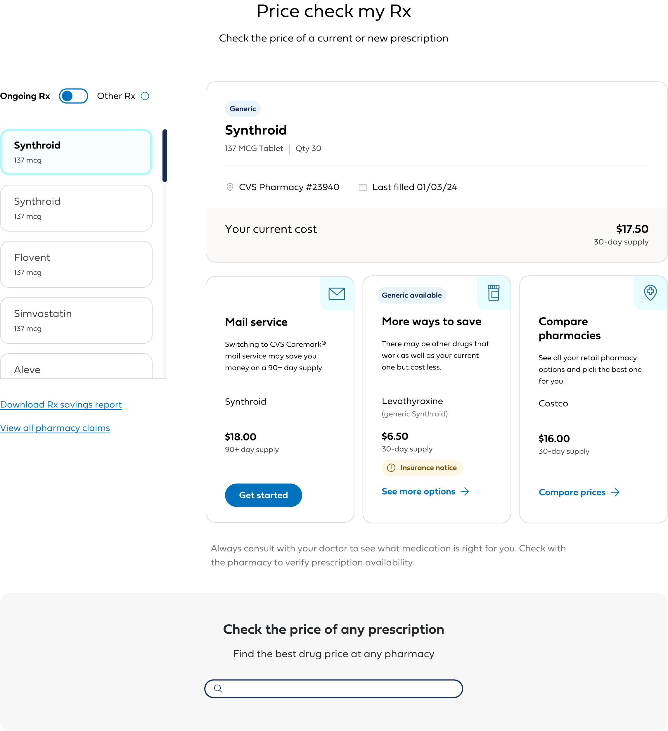 When a user clicks “More ways to save” they see a price comparison matrix of different pharmacies as well as generic alternatives of the same drug.